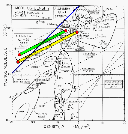 (E*/r*) = C curve shows the effect of shape change on the CFRP spar and the yellow curve the effect of shape change on the Aluminum spar. The shapes in both cases are self similar over the range of fB values shown. The CFRP zone lies above the aluminum alloy zone and makes this a better material choice taking into account Young's modulus, density, and a possible spar configuration. The blue line on the diagram represents the selection criterion (E/r2) = 10. Materials that are above the line meet the criterion.