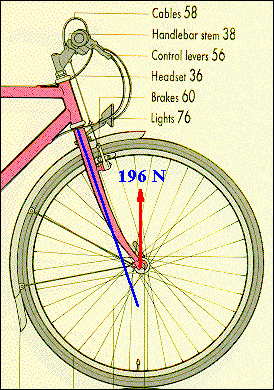 The front fork is another component that experiences an off-axis force and hence a bending moment. The diagram shows the force at the wheel axle for a statically loaded bike and this makes an angle of approximately 19.50 with the centerline of the front fork (blue line). the force can be resolved into a component along the tube, FP = 196 cos(19.5) = 185 N, and a force normal to the tube, FN = 196 sin(19.5) = 65.4 N. The parallel force puts the tube in compression, the normal force gives rise to a bending moment that has its maximum value at the bottom head-set bearing.