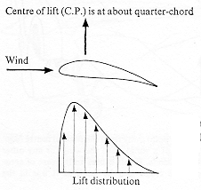 lower diagram shows the lift distribution over a typical airfoil in steady state.