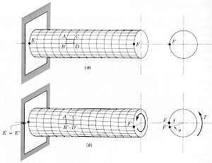 end. This causes the shaft to twist as shown in (b) and the outer elements of
