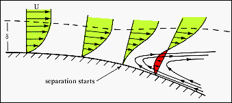 Flow separation starts at the point that the shear force (wall friction) on the near surface fluid goes to zero (i.e. the velocity gradient goes to zero). Past this point, near surface flow may be in a direction opposite to the free stream flow and the streamlines shown illustrate this reverse flow. Because the initial velocity gradient is lower in a laminar boundary layer than in an equivalent turbulent boundary layer, the latter can remain attached further downstream. As long as the boundary layer is attached pressure recovery continues. The turbulent boundary layer, therefore, permits more pressure recovery and hence reduces pressure drag. This pressure drag reduction more than compensates for the increased skin friction of the turbulent boundary layer. |