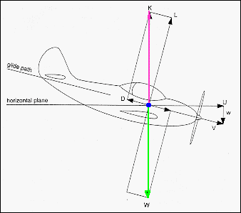 Angle = tan-1(w/U). The resultant, K, of the lift and drag forces just balances