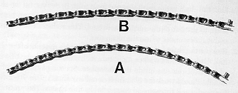 Friction between the chain and the gears needs to be minimized to reduce the energy losses in this part of the transmission. The diagram indicates the inner and outer plate construction of a low friction roller chain. The roller rides on the pins connecting the plates on either side of the chain. Friction between the rollers and the gear teeth causes them to rotate rather than slide and thus energy losses are reduced. This chain type is used on most modern bikes. The movement of the side plates with respect to the pins causes wear that shows up in the transverse sag of the chain that is illustrated in the photograph. Chain A is an old chain with pin/plate wear and is compared to a new chain, B. The nominal length of a complete link in a chain is 1 inch with a chain pitch of half an inch. As the chain wears, the effective length of the link increases. Chain A has worn enough that replacement is appropriate. Chain length is altered by adding or removing links. Adjustment of the rear wheel location is used to provide correct chain tension for the fixed or epicyclic gear box rear hub.