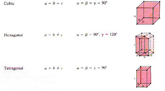 · Side and angle relationships for the cubic, hexagonal, and tetragonal lattices are shown below.