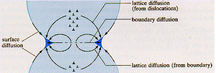 · The transport paths involved in generating a "neck" region between particles are shown above. Surface diffusion, boundary diffusion, diffusion along dislocation cores, and bulk diffusion, contribute to material transport to the neck. Vapor phase transport can also occur. |