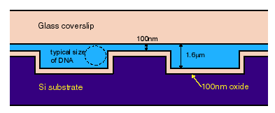 The diagram shows the dimensions of a nano-channel designed to act as a sieve for macromolecules. In the deep channel the molecule is in a convoluted, high entropy, configuration. To pass through the narrow channel, it must elongate and reduce its configurational entropy. The molecule is pulled into this configuration by an applied electric field. Upon reaching the next deep channel the molecule increases its configurational entropy and "balls up" once again. |