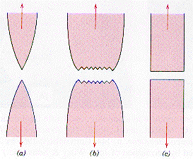 · Rupture (a) is for a highly ductile material that necks down to a point or line: gold, indium; Ductile fracture (b) shown for a typical polycrystalline ductile material: aluminum, iron; and Brittle fracture (c) for materials such as glass and high carbon steel. |