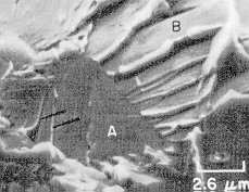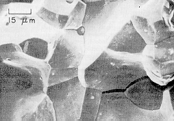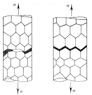 · A brittle material fails by rapid crack propagation normal to the tensile axis. In a technical material the crack may propagate through the grains (trans-granular fracture) or along grain boundaries (inter-granular fracture) as illustrated for carbon steel and Armco steel with oxidized grain boundaries. |