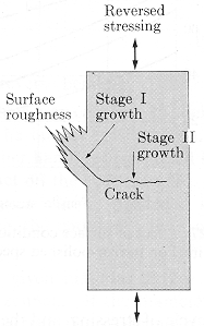 · In stage-II, the crack changes direction and grows in length normal to the tensile axis. · In this stage, dislocations on planes of maximum resolved shear stress move in each stress cycle and cause the crack tip to advance. Periodic sharpening and blunting of the crack occurs under this reversed stressing condition as illustrated below.