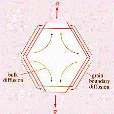 · In materials where the applied stress is below that required to activate Frank-Reed sources and cause dislocation controlled creep, these transport processes are the main creep mechanism. · The transition between control by bulk diffusion rather than grain boundary diffusion will depend upon temperature because of the lower activation energy associated with grain boundary transport, |