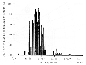 area between rivet holes that had undergone fatigue failure along the dominant