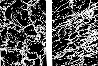 · Scanning Electron Micrographs (SEM) of the 1018 steel fracture surface show the dimples formed by void coalescence in more detail. · The equiaxed dimples (left) formed in the flat center of the "cup." · The elongated dimples in the conical shear lip are shown on the right. · Magnification is x 1250 for both photographs.