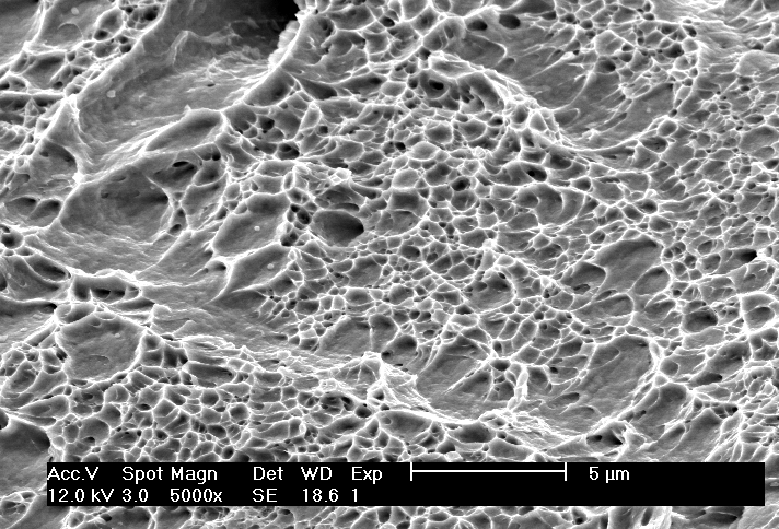 Scanning Electron Microscope photograph of a stainless steel bicycle spoke fractured in uniaxial tension. Dr. Nan Yao, Princeton Materials Institute