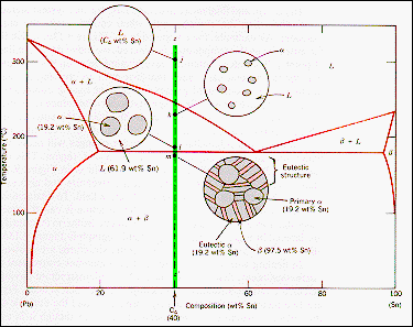 · Above 300 C (j) the alloy is a homogeneous liquid. On cooling to (k) the α-phase has started to solidify, and α-crystals continue to grow until the eutectic invariant temperature (183 C) is reached (l). |