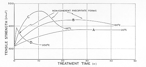 · The material is then reheated to the temperatures shown and its tensile strength is measured for various isothermal heating periods.