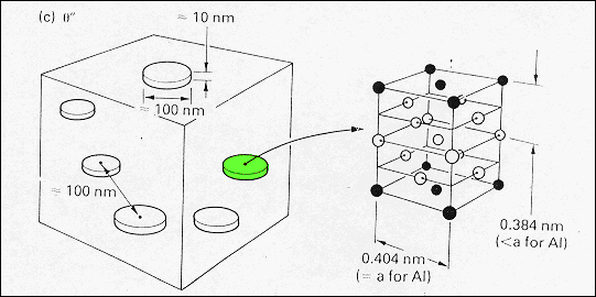 · Growth by solid state diffusion of copper to the larger G-P zones (c) generates the θ''-phase of CuAl2 . The faces of these zones remain coherent with the matrix giving the maximum coherency strains. |