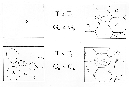 · TE is the equilibrium temperature at which the α and β -phases can coexist. · Gα(T)and Gβ(T) are their Gibbs functions. · Homogeneous nucleation starts in the bulk of the first phase. Inhomogeneous nucleation starts at grain boundaries, surfaces, or dislocations.