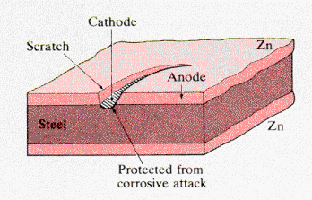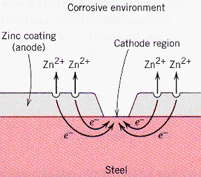 · In a moist atmosphere, a galvanic (composition) cell may be established in these multicomponent metal structures if the protective film is scratched. · The diagram shows a steel substrate with each surface plated with a layer of zinc. From their relative positions in the electrochemical series (Zn: -0.76 V, Fe: -0.44V), zinc is seen to behave as the anode and steel (iron) as the cathode. · The electrochemical reaction corrodes the anode, and, due to the large area ratio of the anode to the scratch-exposed iron, the zinc coating continues to protect the steel, which is cathodic and, therefore, not corroded. Only when the zinc is completely removed in the corrosion process will the steel will be attacked. From: Callister, "Materials Science & Engineering," Wiley (2000) |