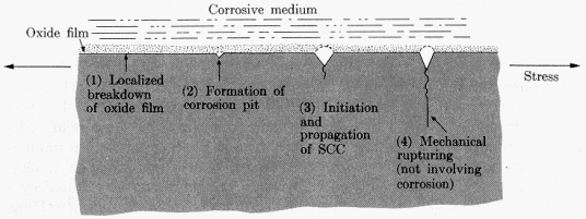 · Application of the stress causes localized failure of the protective oxide coating which permits contact between the metal and the electrolyte. Local pitting of the metal occurs at this site (2) and the pit continues to grow with time. · Stress corrosion occurs at the sharp base of the pit (3) and corrosion enhanced crack growth occurs. · When the crack has grown to the critical size for rapid crack propagation in the material at the applied stress level, mechanical rupture (4) causes material failure. |