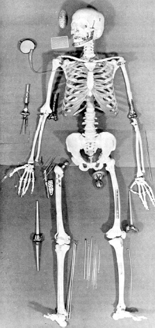 · The photograph shows the extensive use made of artificial components in restorative surgery. · The majority of the load bearing devices are metal alloys, frequently of stainless steel or titanium alloys. · In joints, lubrication and wear is an important issue for implant life. Polymers, such as very high molecular weight polyethylene, are used in the load bearing cup socket of hip, elbow, and shoulder joints. Typically these systems last about 10 years before requiring replacement - another major surgical intervention. · Electronic systems are also implanted for pacemakers, control valves, and long-term drug dispensing devices. These need to have a protective package, some with exterior access. · In long term chemotherapy, vein damage is a problem and a "port" and permanent vein catheter are employed. This is a multimaterial structure with a titanium alloy body, a silicon rubber membrane through which access to the blood system is gained, and a polymeric tube for connection to the vein. |