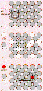 (b) a substitutional alloy between copper and zinc (a brass) where both