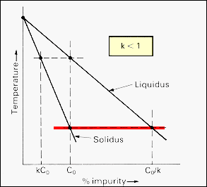 | The distribution coefficient, k, is a measure of the rejection ratio of impurities in a solidification process. As shown in the partial phase diagram, for a sample freezing at a temperature T (red isotherm) the impurity content of the solid is C0, and the impurity content of the liquid in contact with the freezing interface is C0/k. The ratio of the impurity content of the solid to that of the liquid is k, where k is less than one. Purification of the solid has occurred upon freezing. | ||||||||||