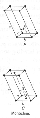 monoclinic structure has two unit cells. The primative cell (P) has fractional