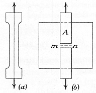 E. Orowan described experiments in which mica sheets were tested in tension using samples of different configuration as shown in the diagram. He found that the conventional tensile test samples (a) failed at a tensile stress ten times less than the same material tested in the (b) configuration. This behavior was ascribed to the presence of edge cracks in (a) that were placed in tension, whereas those in (b) were not loaded by the grips A. This was a further extension of the Griffith concept of incipient cracks being responsible for brittle fracture. In