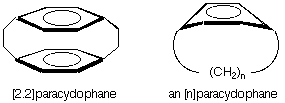 This molecule is a "carboranophane," a carborane analog of a cyclophane. Cyclophanes have a long and varied history. Years ago Don Cram first made [2.2]paracyclophane, a molecule in which two benzene rings were held face-to-face by bridging methylene groups. Later, benzene rings bridged by a single strand of methylene groups were made, and for a while we held the world's record for the shortest chain (n = 6 and 7). Our carbene route to [n]cyclophanes has now been eclipsed by beautiful work by the groups of F. Bickelhaupt in Holland and Yoshito Tobe in Japan who were able to make molecules with even smaller bridges. Evidence for [4]paracyclophane now exists. Much of the interest in [n]cyclophanes stems from the question of how the benzene ring, which surely prefers planarity, will cope with the bending strain induced by the bridge.