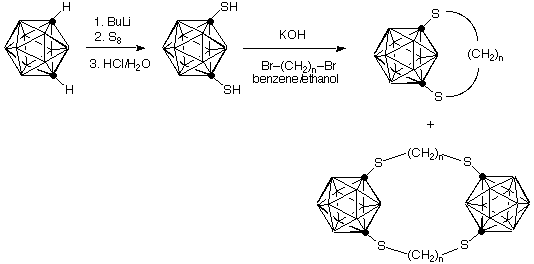 The carboranes are three-dimensional analogs of benzene. Thus the question arises of how the rigid cage will react to bridging by a short chain of carbon. The molecule shown represents out first efforts to expand our traditional cyclophane work to these boron-carbon cages. Our synthesis of the carboranophane is shown below. Notice that Lisa Barnett-Thamattoor's synthesis provides a bonus in the isolation of a (remote) analog of Cram's [2.2]paracyclophane as an additional product.