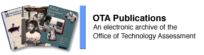 The complete set of OTA publications was published by the Government Printing Office on a set of CD-ROMs in April 1996. These disks are now out of print but may be available in libraries. We welcome your comments and questions about this site; please direct them to ota@princeton.edu