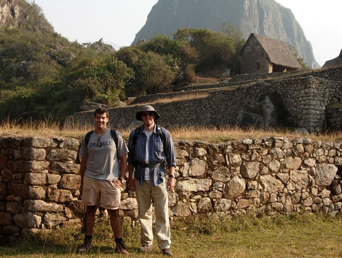 Dan Chirpich '01, left, and Andrew Gossen '93, Princeton 's associate director for alumni education, explored the grounds in the morning while several other trekkers climbed Huayna Picchu to get another view of the site.