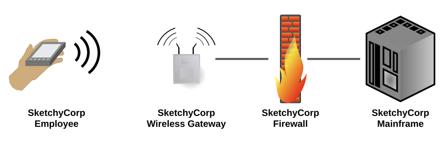 SketchyCorp employees connect to the wireless network using WPA2-PSK security. From there, they can access the SketchyCorp firewall, which allows company employees to log in and gain access to company mainframe.