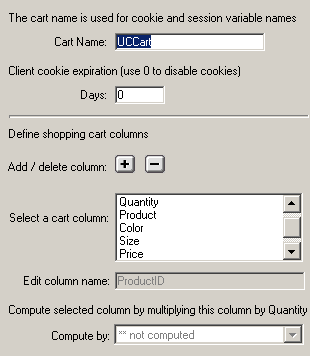 The Shopping Cart ObjectDefining the Shopping Cart object must be done at this point since it will appear on several subsequent pages. I didn't use it on my List.asp page but I am going to use it on the Details.asp page so I'll define how to create it here. On the Details.asp page go to Server Behavior and select UltraDev Shopping Cart/Shopping Cart. This dialog box will come up. Several fields are required in all Carts (ProductID, Name, Quantity, Name, Price, Total). You can change these names (I changed Name to Product), you don't have to use them all, but you can't remove any of these since they are hardcoded in the UltraCart code. If you want to track other information in your cart like size or color, select the + and add those column names. By default there is only one calculated Column--Total (Price * Quantity) which is again hardcoded into UltraCart. You could create other computed columns like Shipping (weight * Zone). Whatever extra columns you add items will be maintained in the cart and can be used just for display to the customer and/or they can be written to your OrderDetails database during the Check Out process. For example you might show the customer shipping weight in your Cart as drawn from the Product table but you don't want to save that information in the OrderDetails table. You would want to say the shipping cost for each item (weight * zone). When you add or change names you want them to be the same field names as exist in your database. That will make it easiest for the UltraDev behaviors to save the cart information to the correct database field. For more details on setting up the Cart, see UltraCart help files by clicking on UltraDev Help and select UltraCart Help. UltraCart