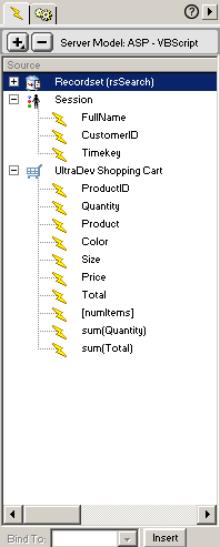 Product Details PageClicking on the hyperlinked Product Name on the List.asp page takes the user to the Detrails.asp page. The Details page includes the Search recordset and the Shopping Cart. In order to add information into the Cart you need to enclose the entire detail record within a form. Place a hidden form element named ProductID within the form and bind it to the ProductID in the Search recordset. This is to make sure that Product ID is written to the Cart when you press Add to Cart. Many of the fields in the form are static and simply drawn from the database (Product Name, Price, etc.). Some fields like Quantity, Size and Color are ones that you need to user to interact with and make selections/entries. Set up these as the appropriate type of form elements and give them names that correspond to your Cart. The Add to Cart via Form SB is used to add the order information into the Cart. The recordset shows two fields: AvailableColors and AvailableSizes. Have two edit boxes labeled color and size where, when appropriate, the user would type in the correct size or color. When the user presses the Add to Cart link or button, the ProductID, ProductName, Size, Color, Price, and Quantity are added to the Cart.