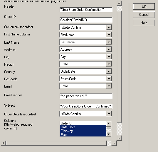 The OrderConfirmation page also includes an E-mail SB that sends a confirming E-mail as the page loads. This SB is available from the Macromedia Exchange. Email Order SBThe Server extension was written by Julian Roberts and is available at charon.co.uk/Downloads/EmailOrder.mxp. Simply insert the SB on the Order Confirmation page and select the appropriate fields from your database. You must already have set up CDOMail to work on your server.