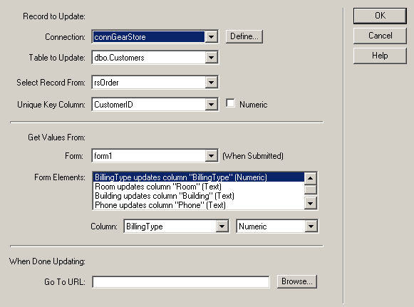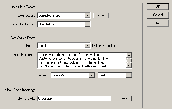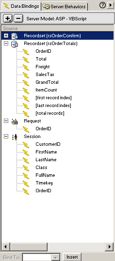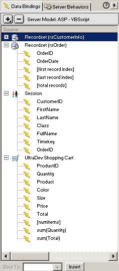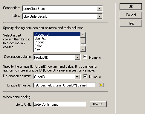The way the UltraCart code is written there must be an Insert or Update Record SB on the page that fires before you an run the Save Cart to Table SB. [Note: Rick Crawford's Access solution writes first to a dummy table to get the next OrderID. This is not the best approach in terms of database integrity. His SQL version does both through one stored procedure.] To get around his coding requirement we can Update the Customer table using the Update Record SB. This could be helpful for getting updates on new address, credit card, or shipping information. Now we can add the Save Cart to Table SB and select the appropriate fields in the OrderDetails table to insert data from the Cart. When you insert the Update Record SB UltraDev will put it at the top of the page. Move that code down so that it comes below the Recordset behaviors for rsOrder and rsCustomer info the page and so that it is still above the Save Cart to Table SB. If you don't do this move, your page won't work. We need to pass the newly generated OrderID into the OrderDetails table. Add a Hidden Field in the form called OrderID. Select the form element and the bind it to the value for OrderID returned from your rsOrders recordset. The other option is to set the OrderID as a Session variable using this code. Depending on which approach you use the recordsets on the OrderConfirmation.asp page will either take Request("OrderID") or Session("OrderID") as their Run-time parameters. We have two recordsets on the Orders page, one for the customer and the other for the orders. In order to properly do the update we need to make sure that UltraDev knows which recordset is our primary one. At the bottom of the page you will see a Hidden Field UltraDev generated by UltraDev. You need to make sure that the value of this field is set to Recordset.Field.Item("OrderID") Pressing the Complete Order button fires a number of actions: Update Customer Record SB and the Save Cart to Table SB. The one disadvantage to this approach is that if the customer aborts the order before pressing the Complete Order button a row has already been written into the Orders table but there will be no corresponding OrderDetails rows. Once I can decipher Rick Crawfords' stored procedure code I will move to a one-step stored procedure where Orders and OrderDetails gets written at the same time.