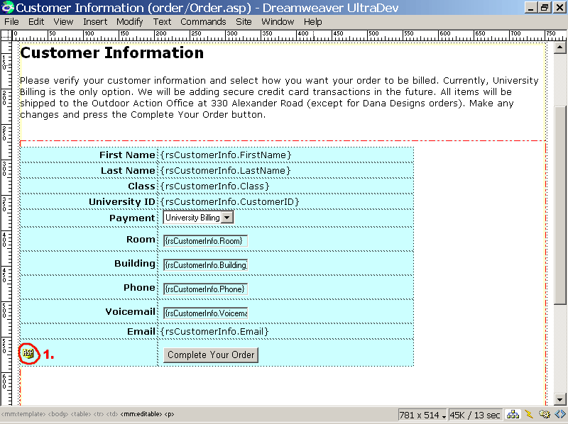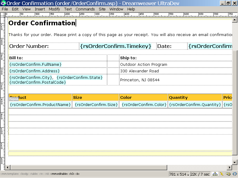 Order PageA simply redirect here can be used for new customers. Once the user presses the Submit Order button on the Checkout Page simple VBScript code can redirect to either the Order Page to confirm shipping and billing information or to a New Customer Profile page if the CustomerID cookie or session variable does not exist. Since our example has the customer already logged on we go straight to the Order.asp page. You will see two recordsets on this page, rsOrders and rsCustomerInfo along with the Shopping Cart. The action of submitting the Checkout.asp page added a new record to the Orders table with the CustomerID and Timekey and then redirects the user to the Order.asp page. Then the CustomerID and Timestamp generated from the Checkout page are used as a Primary Key pair to retrieve the newly added Order and retrieve the autonumber OrderID from the Orders table (so we can write the correct OrderID into the OrderDetails table). We already know the CustomerID from the Login we pass the CustomerID on to the CustomerInfo stored procedure which brings up basic information about the person for the transaction for the rsCustomerInfo recordset. In a store that doesn't involve an initial login this could be accomplished by a cookie stored on the user's PC that contains the CustomerID or you might have the customer log in here.