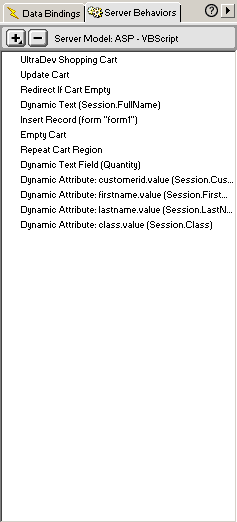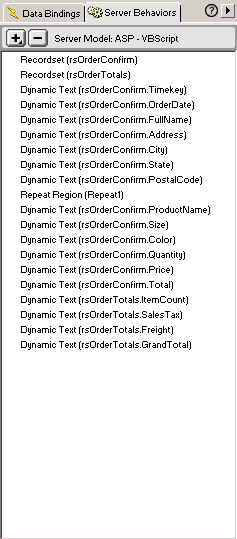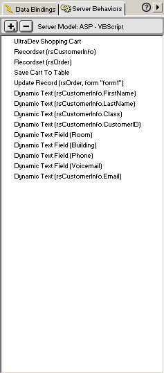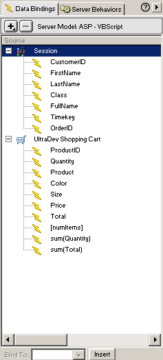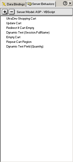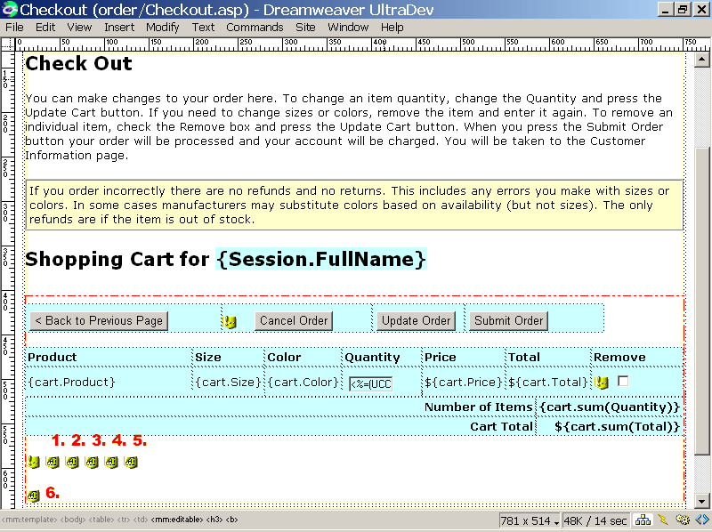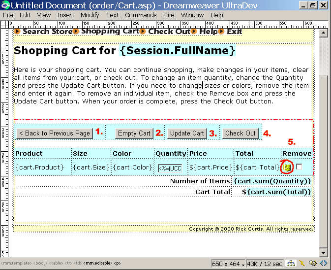 Shopping Cart PageLet's look at this page. We are only showing what is in the Shopping Cart so we don't need any recordsets. Copy the cart from another page and paste it in to Data Bindings. First add a form to the page. In order for items to be updated in the Cart (just like adding to the Cart) you need to have form elements and buttons. Put a table on the page within the form and drag the appropriate Cart columns into the table. Select the row that these columns are on and add the Cart Repeat Region SB. The Cart Repeat Region is built only to work with the Cart and it will show all items currently in the cart (the normal database Repeat Region behavior won't work here). For any items from the Cart that you want the user to able to change on this page you need to create form elements for them and put a form element in the Cart Repeat Region. Here you can see I added a form element named Quantity to allow the user to change the order quantity. I need it to show the Quantity that is currently in the Cart so I need to bind it to the appropriate Cart element (ex. select the Quantity form element click on the Quantity field listed in the Data Bindings window and click the Bind button). Do this will any other Cart fields you want the user to be able to change. The cart is just holding an array of values. You can call those value up and change them, but if the user enters a size that doesn't exist and that gets written to your OrderDetails table how are you going to fill the order. In my case I don't want the user to be able to change size or color here since they might change it to a value that is not available for that item. I want to force them back to the details page to see what the available sizes and colors are. In fact, include instructions that say, "once you have placed a size/color choice in the cart if you want to change it you have to remove the item from your cart and add it again." There should be a set of form buttons along the top of the Repeat Region which also should be enclosed within the form. The repeat region includes one edit box element named Quantity which is bound to the Shopping Cart Quantity element. There is also a Check Box labeled Remove with automatically sets the Quantity to 0. You need to add a few other Cart SB's. Select the Quantity button and add the Update Cart SB. Do this for any other Cart field values you want the user to be able to update. Add the Redirect Cart is Empty SB and select the CartEmpty.asp page. Select the Empty Cart button and add the Empty Cart SB. Then when the Update Cart button is pushed, this item or any items manually reset to 0 are removed from the Cart. The set of buttons provides various functions. [Note: This same setup is applied to the Checkout Page. Create the Cart Page first and then save it as again as Checkout.asp. Then add the remaining behaviors and code to the Checkout.asp page.]