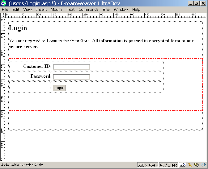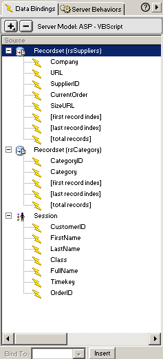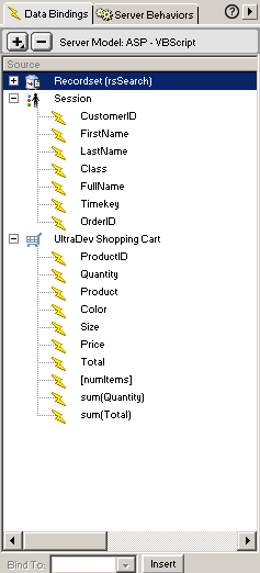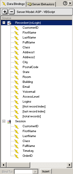 Login PageThis particular store application is a members-only storefront which requires users to log in before accessing the store. This uses a standard Login page with CustomerID and password which then redirects to Search.asp if the login is successful or to LoginFailed.asp is the recordset is empty. When the user logs in, several items (CustomerID, FullName) are written to Session variables so that they can be maintained for later use. Create Session variables for each CustomerID through the Server Data Bindings. These will now appear as available Session variables throughout the site. These Session variables will later be inserted into the Orders table.
