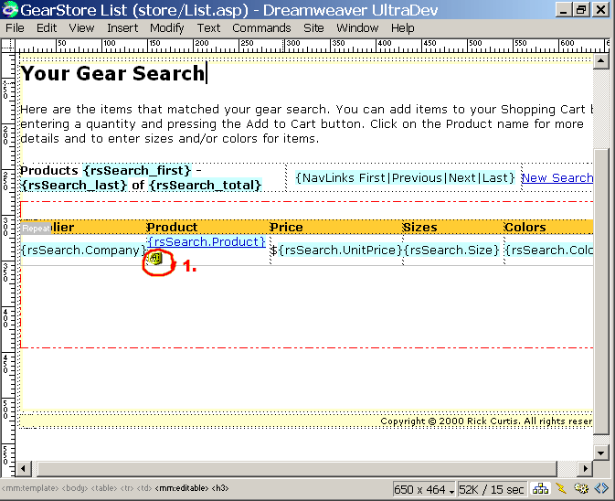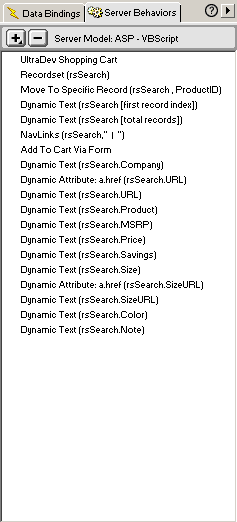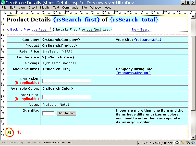 Building an E-commerce Store with UltraDevLots of people have been asking for a tutorial on how to use the UltraCart. I've had this one in the pipeline for a while and I have finally gotten the time to put it together. Hope it helps. If you want to do anything of substance with UltraDev you need to look beyond the skimpy documentation that Macromedia provides with the product. This tutorial is designed for intermediate to advanced UltraDev users. You should already be familiar with how to create recordsets, repeat regions, and forms. It is designed to present the overview of storefront creation rather than show step-by-step guidelines. If you are not that familiar with UltraDev, I suggest you spend some time building sites with material and databases you know well first. There are an incredible range of options for creating an E-commerce application. It is not possible in the scope of one tutorial to cover them all so I'll give you the overview to one approach that I have used successfully. You will need to make you own adaptations to this to fit your business model and database design. I'll show you detailed screen shots of each major page in the site along with shots of the Data Bindings and Server Behaviors so you can see what has been applied to each page. When invisible items like Hidden Fields and ASP code have been added to a page, I have circled the item in the screen shot and marked it with a number. There will be an explanation of each of these items below the screen shot. The underlying database used in this Tutorial is SQL Server 7. You need to be familiar with basic relational database design and it is helpful if you understand how to write stored procedures. For more information check out E-commerce Database Design Principles which shows the underlying database tables used in this tutorial.