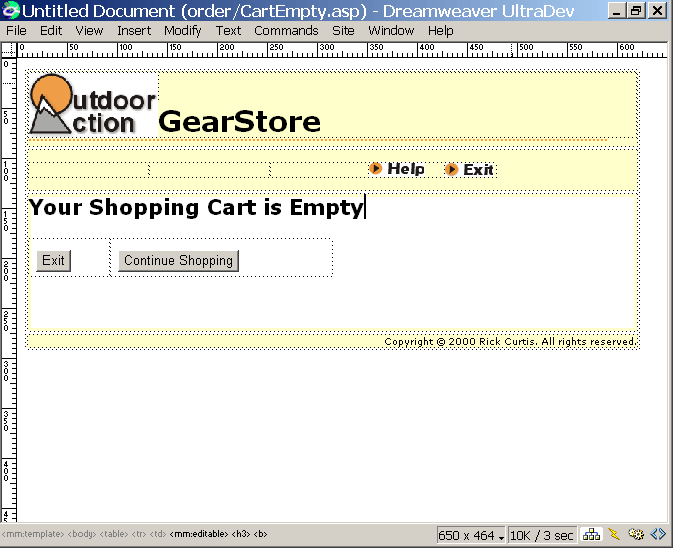 Cart Empty PageThis page simple holds text that says "Your cart is empty." It serves as the redirect page whenever the Cart Page is accessed and it is empty or when the Cart page is full and all items are removed. There are no Data Bindings or Server Behaviors on this page. The Exit button runs an onclick behavior that redirects the user to the start page. The Continue shopping button redirects the user to the Search.asp page. See the onclick code above for button redirects. These buttons are set to None and you can remove the form tags from the page if you wish since no form values are being passed anywhere.
