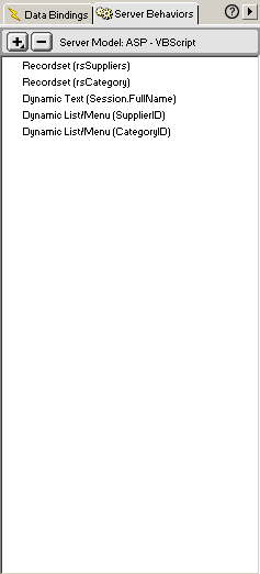 Search PageThe Search.asp page contains two dynamic list boxes, one for Suppliers and one for Equipment Categories. Both allow multiple selections. The values of both of these list boxes are passed to a stored procedure on the List.asp page. The Search page uses a dynamic stored procedure to evaluate the possible multiple list box values and create the correct AND/OR operations on IN statements. [This process of Dynamic Stored Procedure Searches will be covered in the next tutorial]. Below you will see the basic layout of the page and the Data Bindings and Server Behaviors for the page. You will also see the stored procedures that create the recordsets for the two Dynamic List boxes (called SupplierID and CategoryID) which pass their values onto a stored procedure that populates the List.asp and Details.asp pages.
