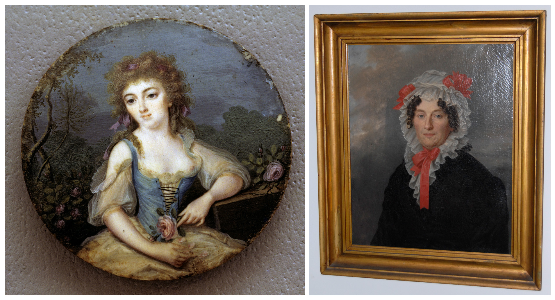 For the left miniature, from Louisiana Portraits: "Of Bordeaux, France; daughter of Bernard Donesan and Marie Lemarque; (shown here at eighteen years of age when she was the toast of Paris); married Jean Baptiste Riviere (1759-1809) of Bordeaux, came to Louisiana with her husband, a friend of the Baron de Carondelet. He was a merchant and their home and place of business was at #41 Levee Street, corner of Bienville. This location was designated by Governor Claiborne as one of the three polling places in the first election to be held in this area in February, 1803."