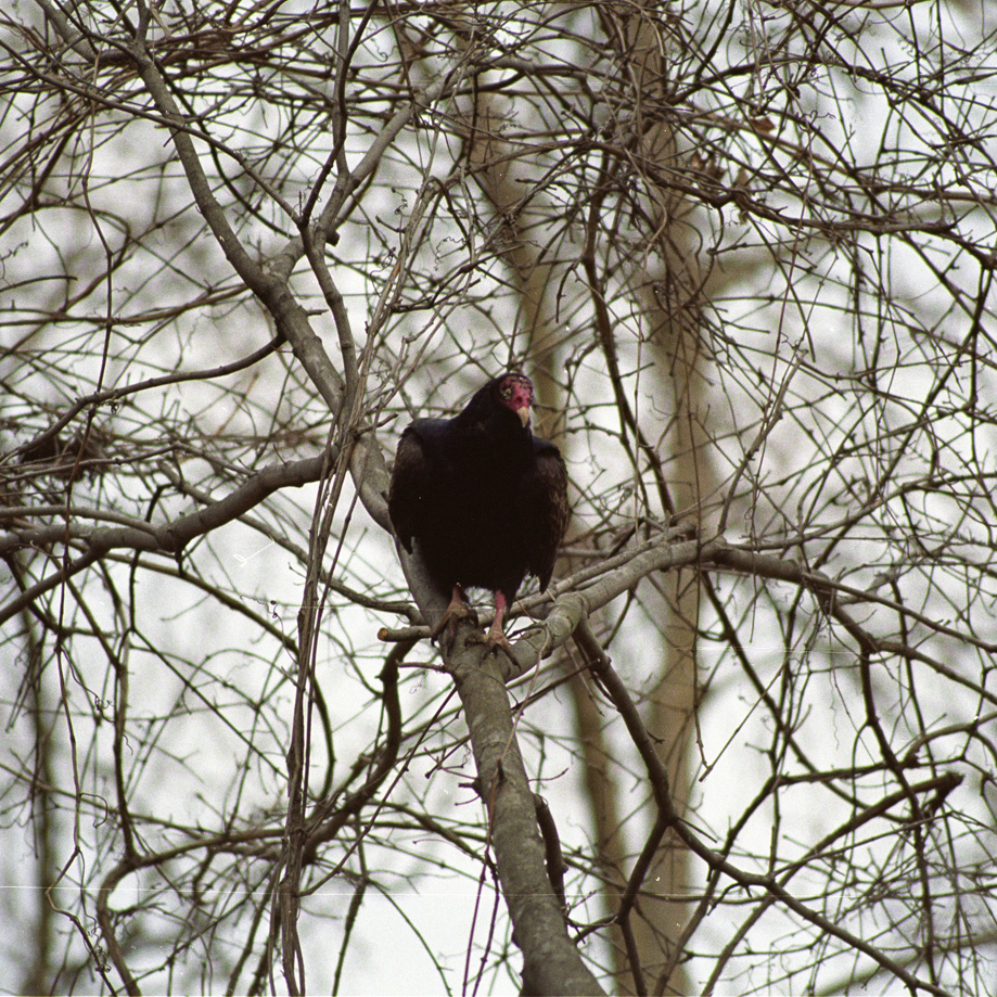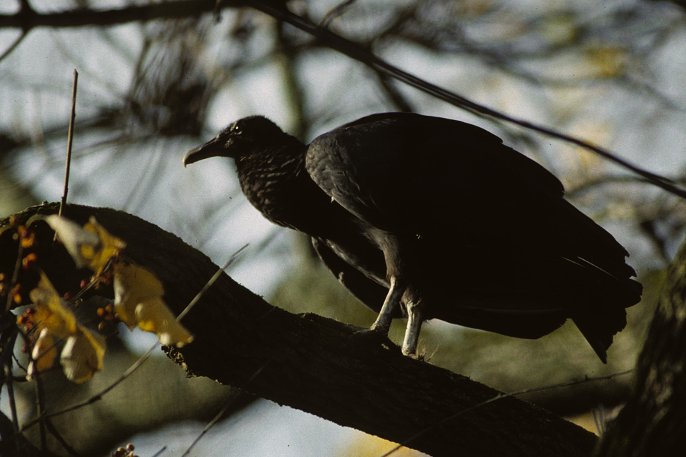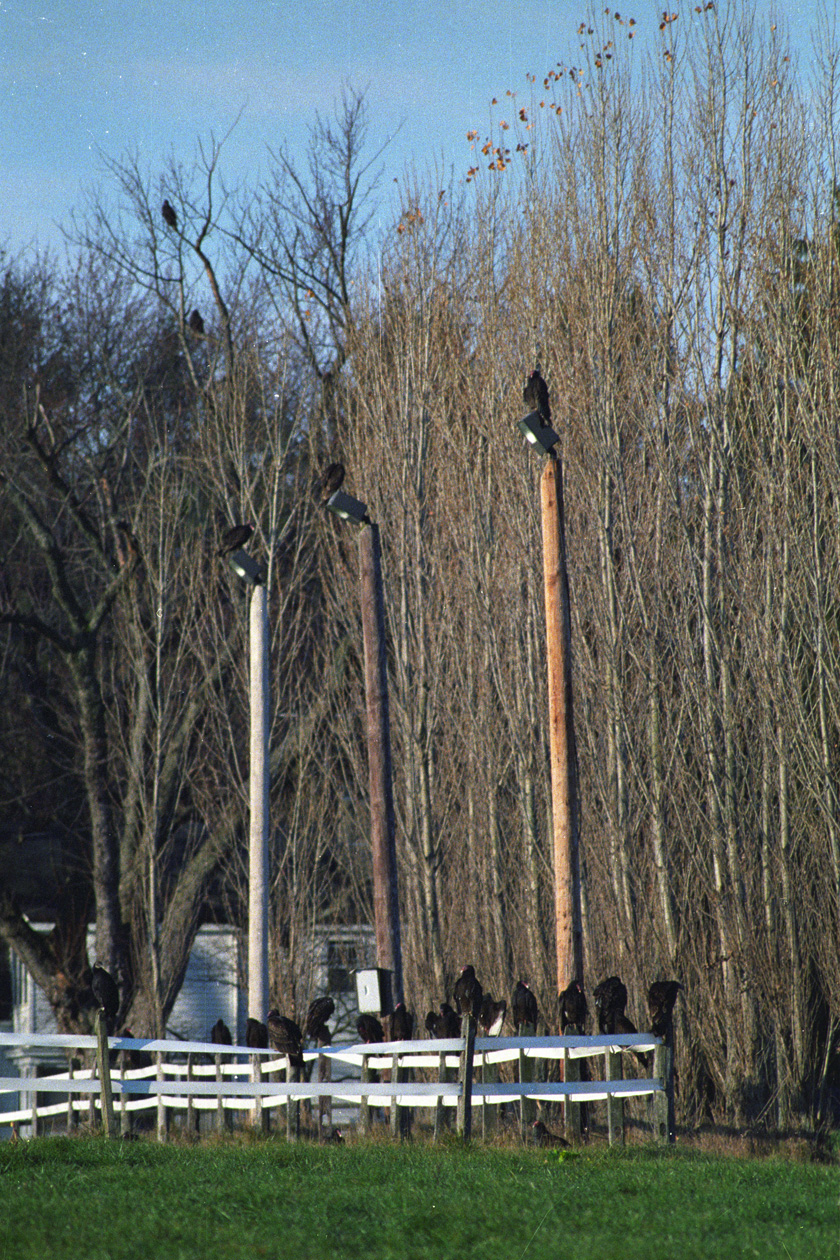 Of course, a superabundance of vermin leads to a profusion of carcasses, and for this reason Princeton has become the Vulture Capitol of New Jersey. Turkey Vultures are most common. Given the number of vermin, the chances are pretty good that a deer, or perhaps a goose or two, will have a heart attack on any given morning. Anticipating this, here is a flock of 25 vultures waiting for breakfast. In the winter, business is brisk; this turkey vulture was waiting for a starving, freezing deer to expire in the local deer necropolis (I have omitted my photo of the prospective meal so as not to offend the sensitive). The Black Vulture is less common, and it does not seem to be as gregarious as the turkey vulture. Turkey vultures find their meals chiefly by smell, black vultures by sight; in a forested area like Princeton, the turkey vultures may have an advantage. An article a few years ago in Sports Illustrated asserted that bird feeders for vultures (outdoor tables stocked with rotting meat) are highly entertaining. I urge all Princeton residents to build one!