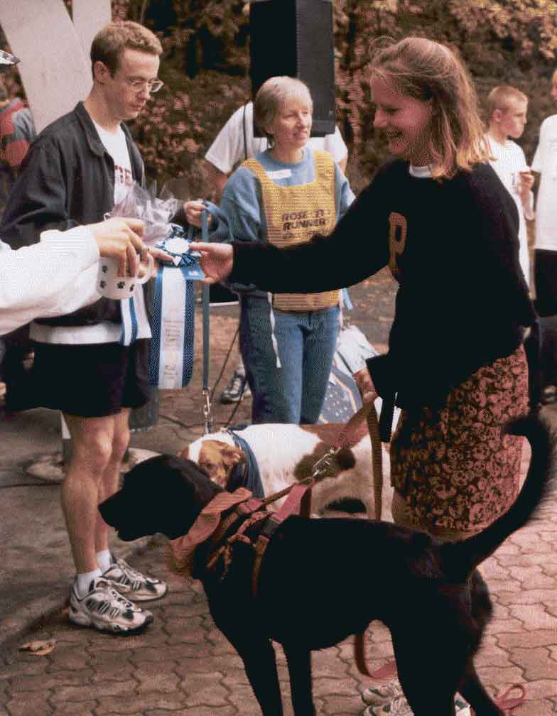Scout ran the first Hounds and Harriers Race. She was really fast. Here we are getting a ribbon. I met Barbara Rushman because of Scout. She is the race director. Barbara is in the background giving out the awards.
