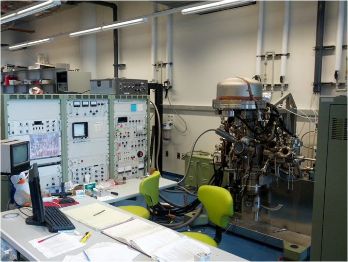 | Electron Spectroscopy for Chemical Analysis (ESCA) or X-ray Photoelectron Spectroscopy (XPS) is one of the most widely used methods for surface science studies. XPS/ESCA provides information about the kinetic energy of excited electrons which are emitted when the surface under study is exposed to soft X-rays. Two types of electrons can be identified, namely core and valence electrons. Using the formula Ek = hv - EB - W0 to determine the distribution of binding energies of the electrons, we can find the chemical composition, and chemical states of the elements present in the top few atomic layers (surface up to 100Å) of the material. Another potential application of the technique is depth profiling which can be either destructive (sputtering of the sample) or non-destructive (angle resolved studies). The Bernasek laboratory is equipped with a VG Scientific ESCALAB MKII spectrometer capable of doing all of the above with a line spread of as low as 1.1eV and a spatial resolution of 100 µm. The instrument has also been retroactively fitted with both a helium discharge lamp for performing Ultraviolet Photoelectron Spectroscopy (UPS), which allows for a more detailed look at the valence structure of materials, and a stage that allows for heating and cooling, ranging between -173C and 800C, in order to study the adsorption and kinetics of gases on a substrate. Some of the main features of the instrument include: | ![]() |